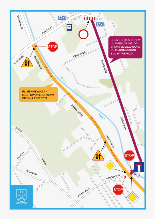 Władze miasta informują także, że w celu usprawnienia ruchu kołowego na czas zamknięcia ul. Jagiellońskiej, wprowadzona zostanie tymczasowa organizacja ruchu na ul. Henryka Sienkiewicza. Ruch będzie się tu odbywać w dwóch kierunkach. Dodatkowo zmianie ulegnie organizacja ruchu na skrzyżowaniu ulic: Henryka Sienkiewicza i Jagiellońskiej, Tytusa Chałubińskiego oraz Stanisława Witkiewicza.